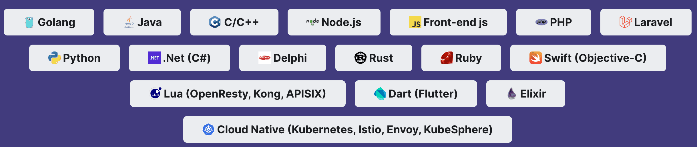 - Hỗ trợ nhiều ngôn ngữ lập trình: Casbin hỗ trợ nhiều ngôn ngữ lập trình như Golang, Java, Python, C++, Rust và Node.js, cho phép bạn tích hợp Casbin vào ứng dụng của bạn dễ dàng hơn.